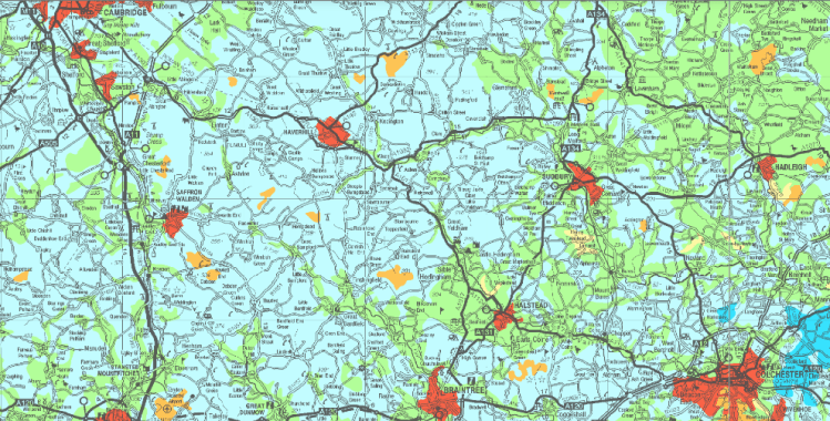Above – Detail of farmland grade of land east-north-east of Cambridge (bottom left) up to the towns (in red) of Thetford (with the forest in muddy orange), and Bury St Edmunds on the right.