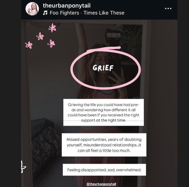 One of the things I often do when doom-scrolling is screen-grabbing anything that I think might be useful to refer back to or write about in a future blogpost. This was one case by TheUrbanPonyTail who as a late-diagnosed AuDHDer posts a lot of content on this and who popped up in my IGfeed recently. It was her words about Grief – grieving for the life I could have had but never had because had I known, I would have taken some very different life decisions to the ones I ended up taking.