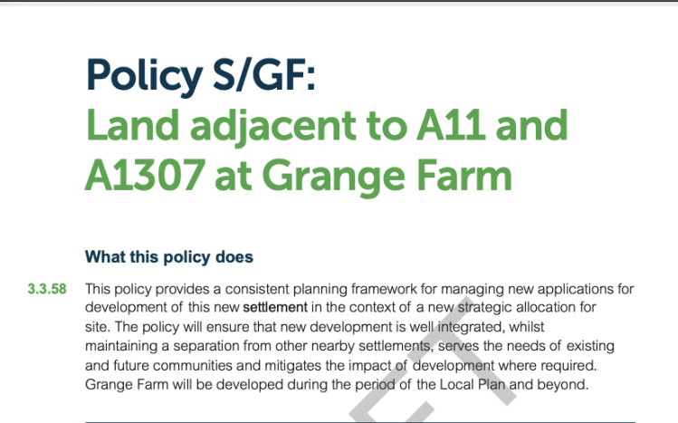 Above – confirmation of a proposed NEW SETTLEMENT at Grange farm – part of a new large site with lots of new homes and employment premises (a ‘Strategic Allocation’)