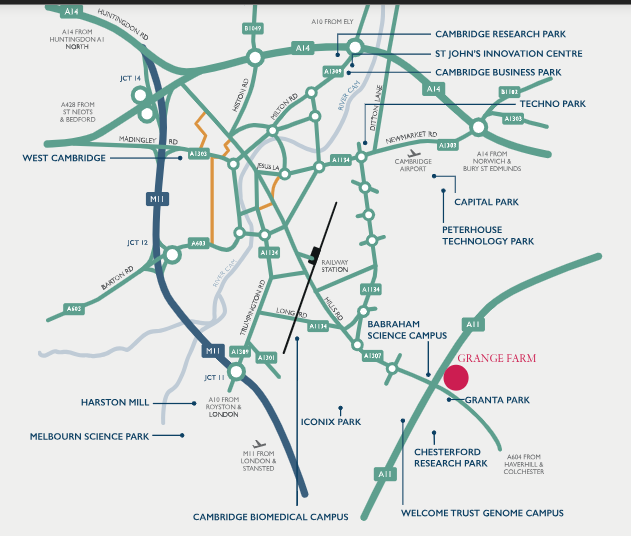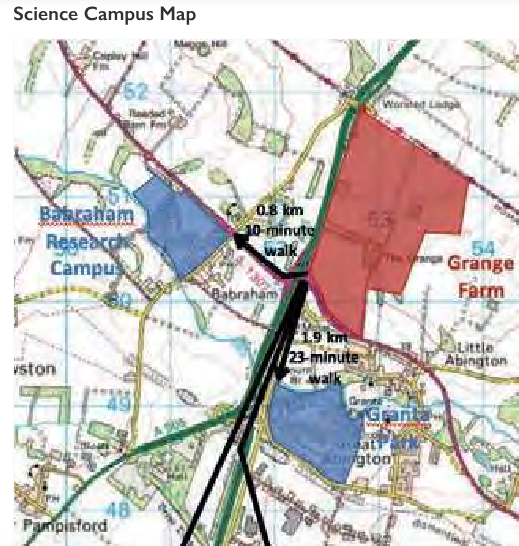 Above – detail of the two nearest sci-tech parks – Babraham and Granta Park being separated by the A11 dual carriageway, Delivery Paper p7