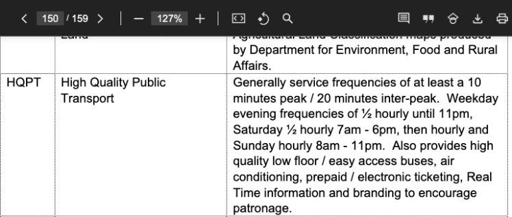 “The Cambridgeshire Guided Busway, currently under construction, is intended to provide a High Quality Public Transport system (HQPT) (services of a minimum 10 minute frequency during peak periods and minimum 20 minutes frequency inter-peak)”