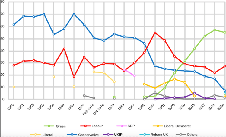 Above – the changes in the electoral fortunes in Brighton Pavilion, which in my lifetime has gone from being a safe Tory seat, to a safe Labour seat, and now a safe Green seat.