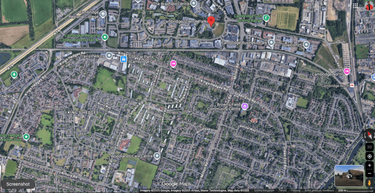 Above – King’s Hedges south of the busway, & Cambridge Science Park to the north. GMaps