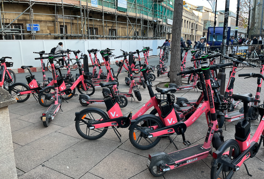 Image: The mess of VOI e-scooters clutterring the streets of Cambridge, symptomatic of irresponsible firms and enfeebled local government in England.