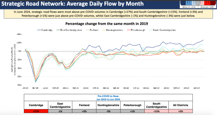 Above – Percentage change in average daily flow 2019-2024. Cambridgeshire Insight