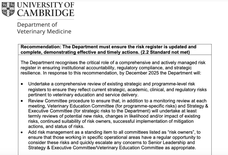 So I was surprised to see that one of the top recommendations from the RCVS inspectors involved maintaining a risk register, and showing how that risk register influenced the making of effective and timely interventions to manage those risks.