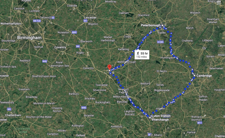 Above – from G-Maps where Northampton, Peterborough, Cambridge, and Luton make for a nice ‘quad’ – with potential extensions westward towards Rugby, Coventry, and Birmingham.