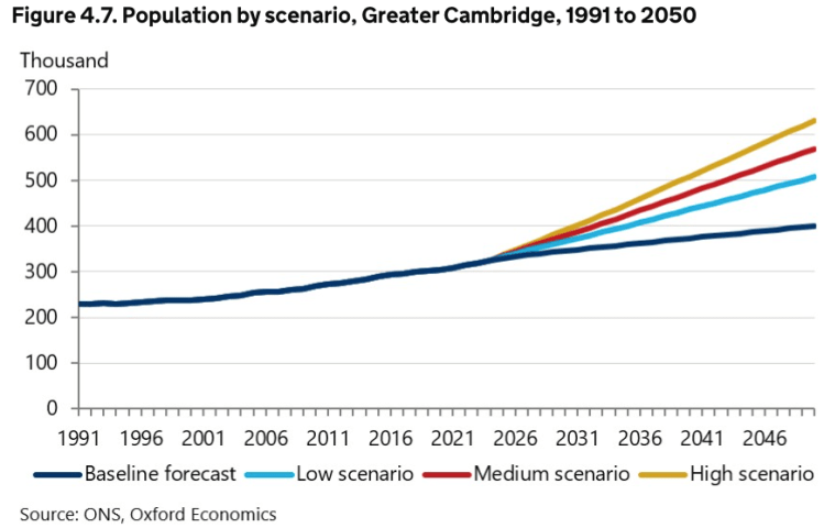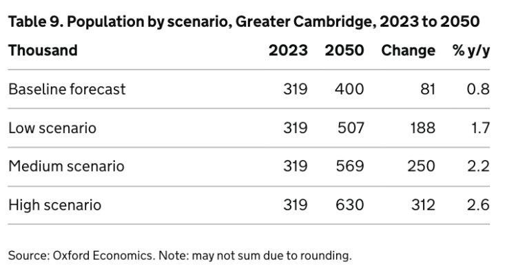 The Oxford Economics report (Nov 2025) for The Government shows the population of Cambridge City and South Cambridgeshire District together could double by 2045 (from 2021)