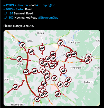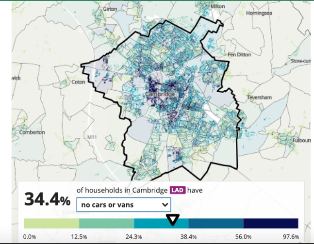 As things stand those claims are laughable. Especially in rush hour. On social media Cambridgeshire County Council regularly publishes transport map diagrams such as the one below-left earlier this morning. Also note the significant minority (over a third) of households that have no cars or vans in Cambridge via the 2021 census.