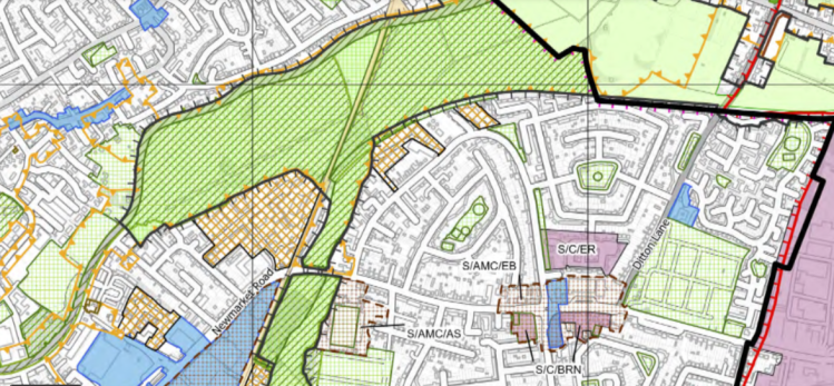 Exactly – it covers the areas of land and the city that have specific functions designated. Which amongst other things can indicate where proposals to build residential housing are prohibited. For example in the detail of the map above, the bits in green are open spaces. The hatching super-imposed means that those green spaces are also protected – such as Coldham’s Common by the Abbey Stadium – and the allotments behind the stadium too. (Where many a football has ended up!)