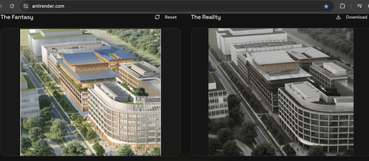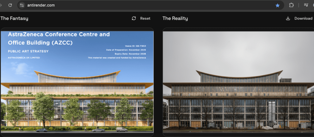 Former councillor Sam Davies MBE also reminded me of the new ‘Anti-render’ app at https://antirender.com/ that turns publicity photos into scenes that building designs might look like on a rainy day after the elements have spent a decade or two attacking the buildings.