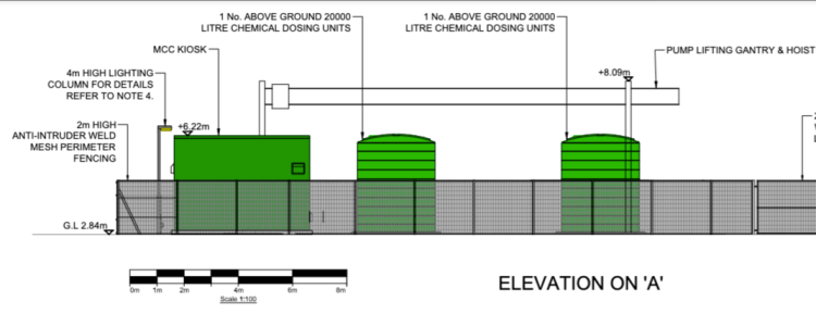 Above – from the Location Plan diagram – those big green units are over 6m tall and the pumping lift poles are over 8m tall