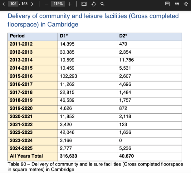 This relates to scrutiny from former Queen Edith’s councillor Sam Davies MBE who wrote dug into the data this time three years ago in this post. Because the data in the table above on gross completed floorspace is meaningless to most people.
