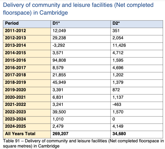 “In the 2024-2025 monitoring year, there has been a net increase of 2,479 square metres of D1 (community use) floorspace and a net increase of 4,149 square metres of D2 Authority Monitoring Report 2024 – 2025 (recreation and leisure use) floorspace in Cambridge”
