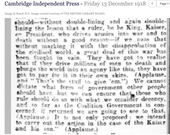 Above – Cambridge Independent Press, Fri 13 Dec 1918 in the British Newspaper Archive