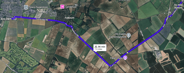 Above – Six Mile Bottom detail from G-Maps – with Fulbourn and what a cycling commute to ARM Ltd’s headquarters on Peterhouse Technology Park – owned by Cambridge University’s oldest college