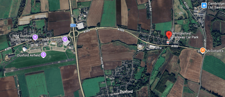 Above – Whittlesford Parkway (on the Cambridge – London Liverpool Street line) on G-Maps with IWM Duxford and Duxford Village nearby, the latter two separated by the M11 motorway, and village pedestrian access blocked by the A505