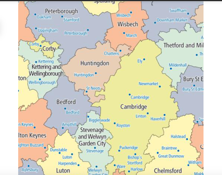 Cambridge’s TTWA incorporates bits of West Suffolk District, most of East Cambridgeshire District, bits of NW Essex / Uttlesford District, and a large chunk of Hertfordshire County.