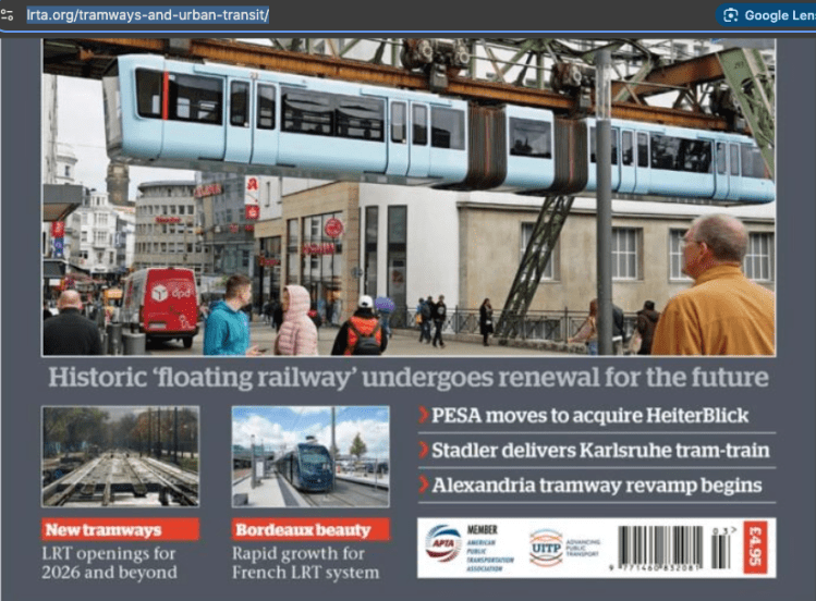 Above – Light Rail and Urban Transit Magazine with its feature on the Wuppertal overhead line and the massive growth of light rail transit in France.