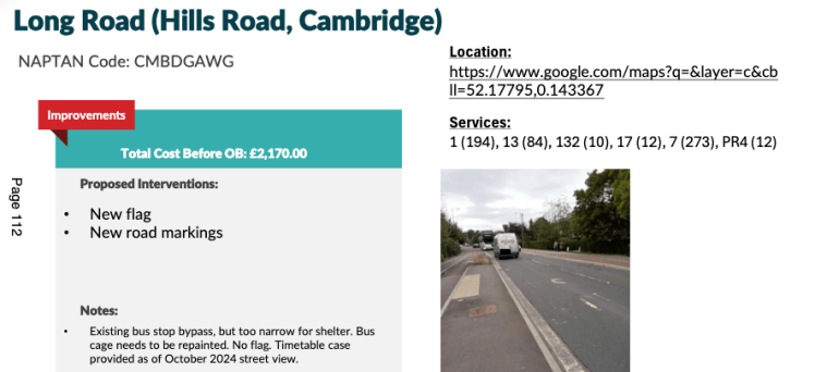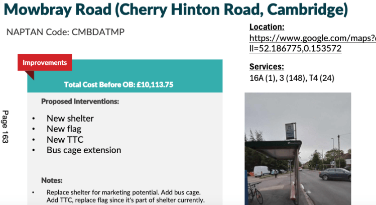 The bus stations at Wisbech, St Ives, and Huntingdon are proposed for improvements. The stops in and around Cambridge are summarised on the map below.
