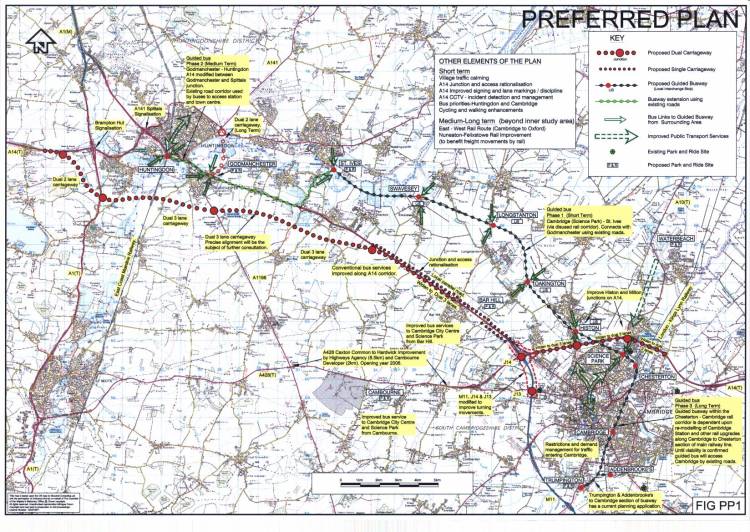 - The widening and partial realignment of the A14 in the corridor to form a dual three-lane carriageway, including a southern bypass of Huntingdon;