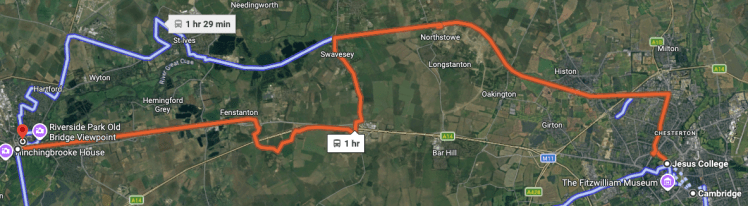Above – over 2 decades later and the orange ‘Tiger Bus’ route brought in by the previous CPCA Mayor Dr Nik Johnson providing a more direct, faster bus route from Huntingdon Railway Station into Cambridge. From G-Maps here.