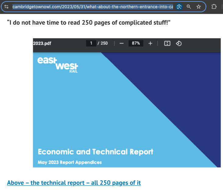I missed this out first time around but Miranda Fyfe of Cambridge & South Cambs Green Party reminded me in this exchange that I had explored the alternative northern approach into Cambridge for East West Rail – in particular examining whether a four-tracked corridor making provision for stops at the passing villages might reduce the opposition at the time.