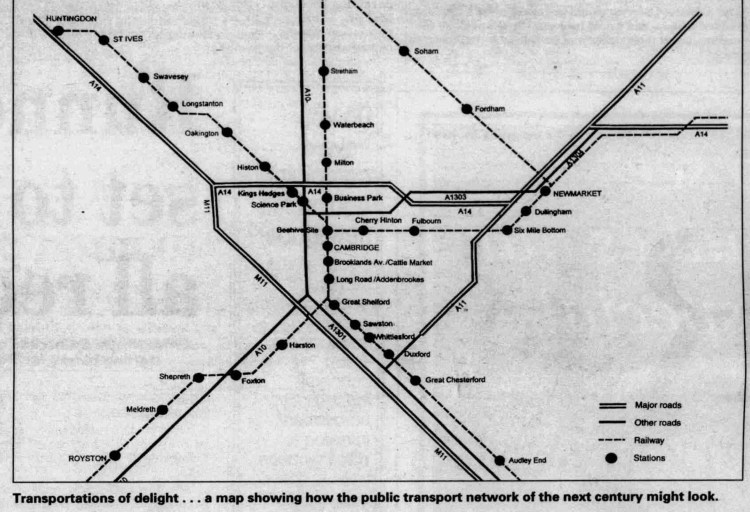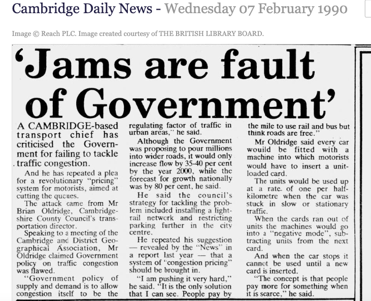 Above – Brian Oldridge, Transport Director of Cambridgeshire County Council in the Cambridge Evening News, 07 Feb 1990 in the British Newspaper Archive.