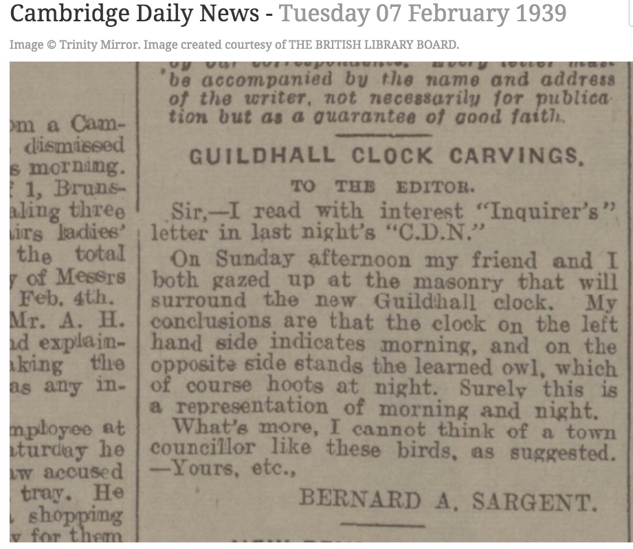 This is Dusk, the Cambridge Town Owl. Dusk originates from the Owl on the Cambridge Guildhall clock, installed in the mid-1930s.
